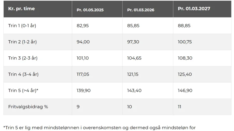 Husk: Satserne er mindsteløn. Det betyder, at du altid kan forsøge at forhandle dig til mere. Er du i tvivl, kan du tage fat i din tillidsrepræsentant og få hjælp.