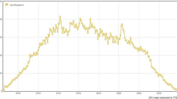 Stack Overflow har i årevis været mange IT-folks foretrukne sted, når man sad fast: et spørgsmål/svar-site med usædvanligt høj kvalitet, som man kunne søge sig frem til igen og igen. Det gælder også mig selv, som tidligere var en flittig bruger. Men en graf baseret på Stack Exchanges egne data peger på et dramatisk skifte.
